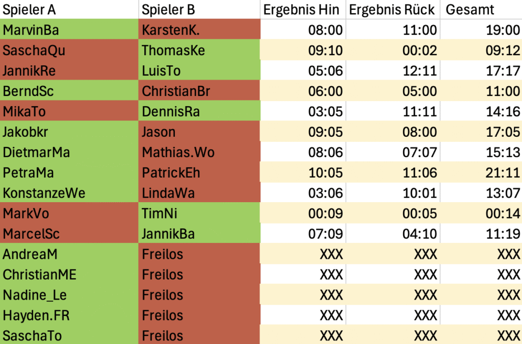 Alle Spieler mit grüner Markierung sind in der 2. Runde.